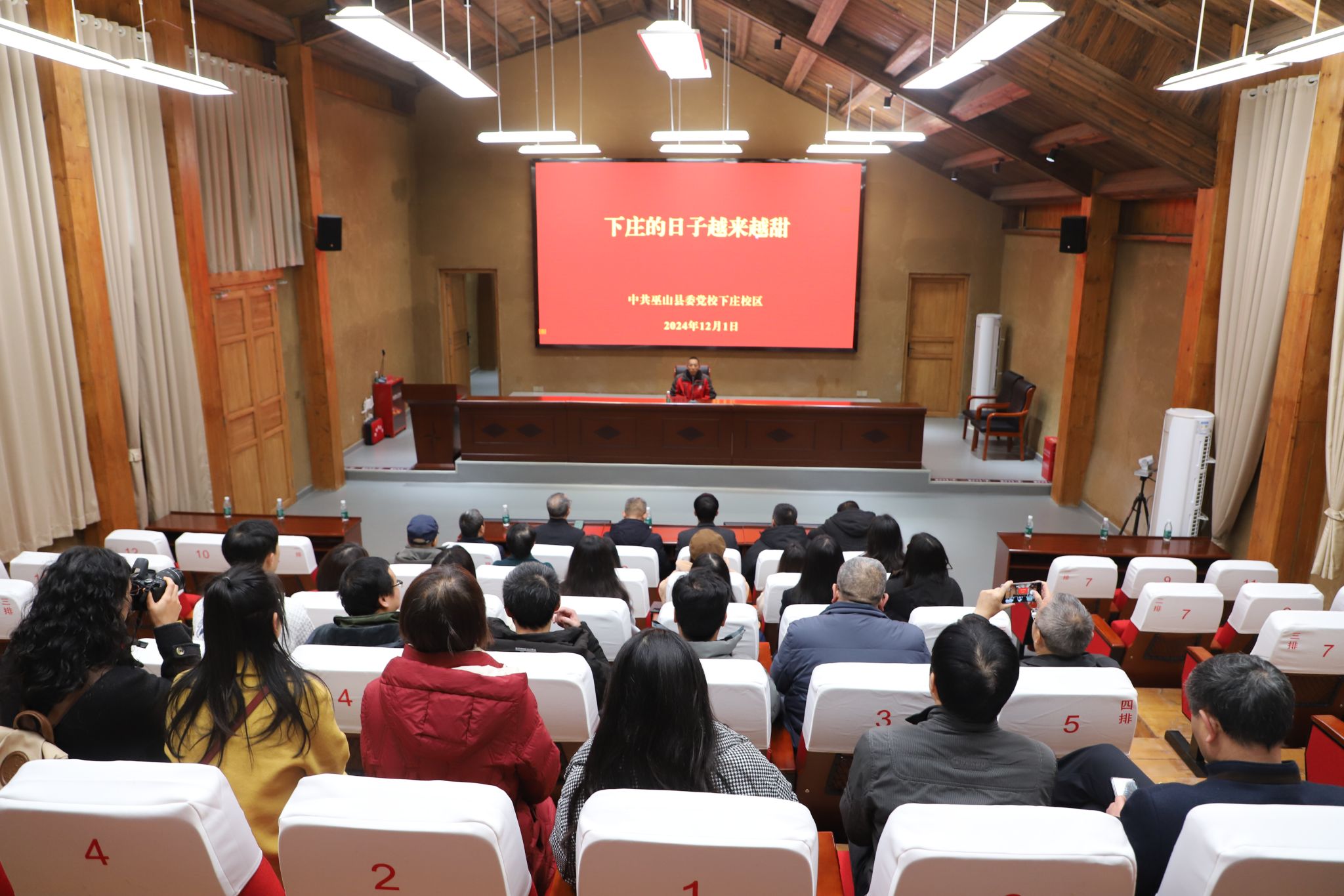 在中共巫山县委党校下庄校区阶梯教室,筑路英雄彭松仁为公司党总支全体党员讲述《下庄的日子越来越甜》。下庄村位于重庆市巫山县,是个“天坑村”。这里四面绝壁,从坑沿到坑底的距离达1100米。从1997年到2004年,下庄村党支部书记毛相林带领乡亲们历时7年,6人付出宝贵生命,在绝壁上一锤一凿修通了长8公里通向外界道路的“天路”。这条路,从“出山路”到“致富路”,让下庄村乡村振兴路越走越宽,村民的生活越来越幸福。他们用生命和汗水谱写了挑战封闭、贫穷与落后的悲壮诗篇,创造了“不甘落后、不等不靠、不畏艰难、不怕牺牲”的下庄精神。