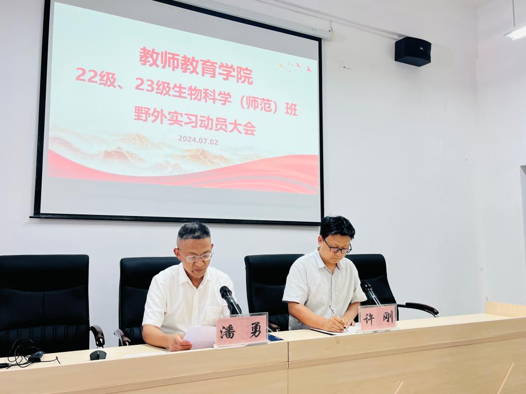 2024年7月2日,bw必威西汉姆联官方网站在博学楼3栋138召开2022级、2023级生物科学(师范)班野外实习动员大会,经理潘勇、副经理许刚、系主任杨俊年、专业课老师沙爱龙、钟彦、辅导员冯梅、邓峥嵘及2022级、2023级生物科学(师范)班全体员工参会。大会由副经理许刚主持。